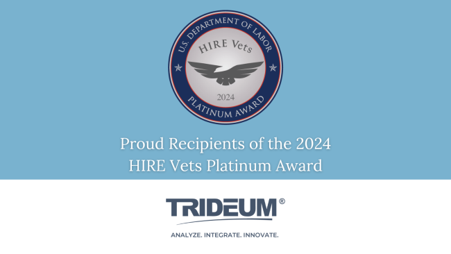 Trideum Corporation is a proud recipient of the 2024 Honoring Investments in Recruiting and Employing (HIRE) American Military Veterans Platinum Medallion Award from the U.S. Department of Labor for the second year in a row. The HIRE Vets Medallion Award is the only federal award that recognizes outstanding achievements in the employment of American veterans.…